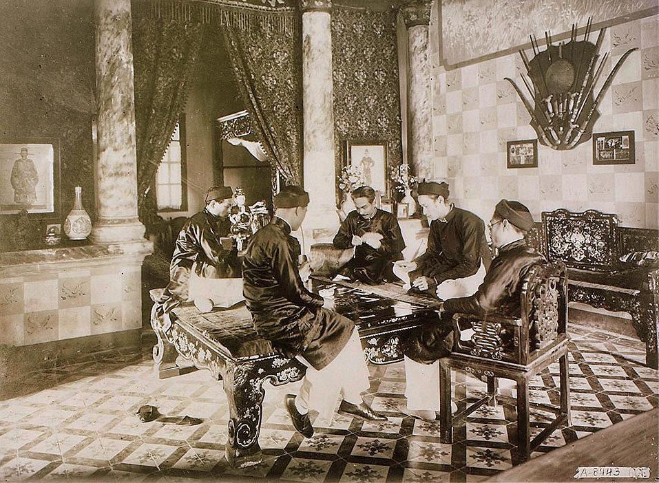 Trò chơi tổ tôm được tổ chức trên một chiếc ván ngựa chạm trổ và cẩn xà cừ
