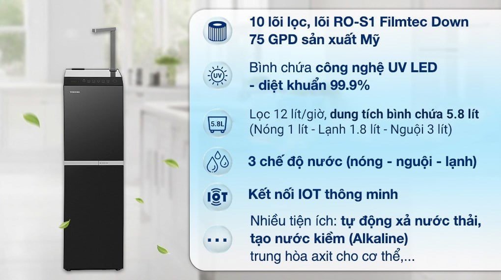 | Toshiba TWP-W2396SVN(M) | ~10 lõi, RO 75 GPD (Mỹ) + đèn UV sau lọc | Nóng – Nguội – Lạnh | Block | Cảm ứng, màn hình hiển thị, kết nối app IoT, khóa trẻ em |