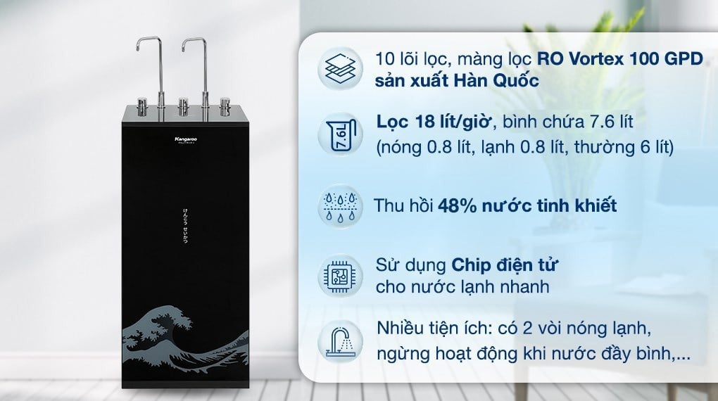 | Kangaroo KG10A12 | 10 lõi, RO Vortex + nước ion kiềm Hydrogen | Nóng – Nguội – Lạnh + nước kiềm | Chip điện tử | Mặt kính tràn viền sang trọng, tự xả thải |