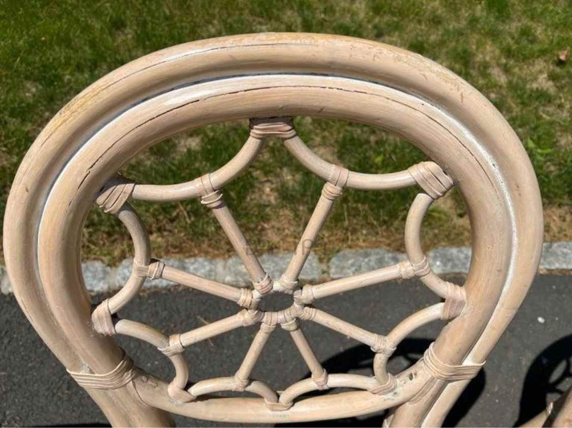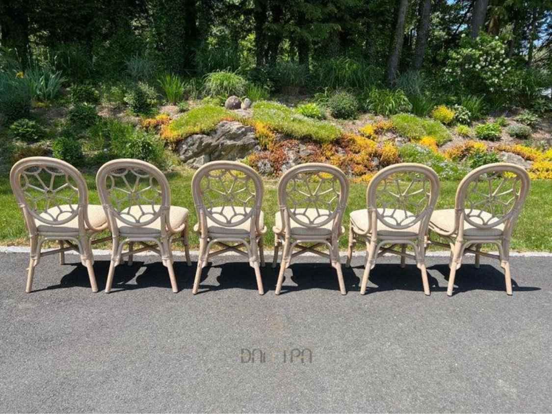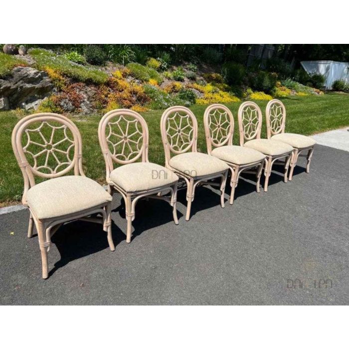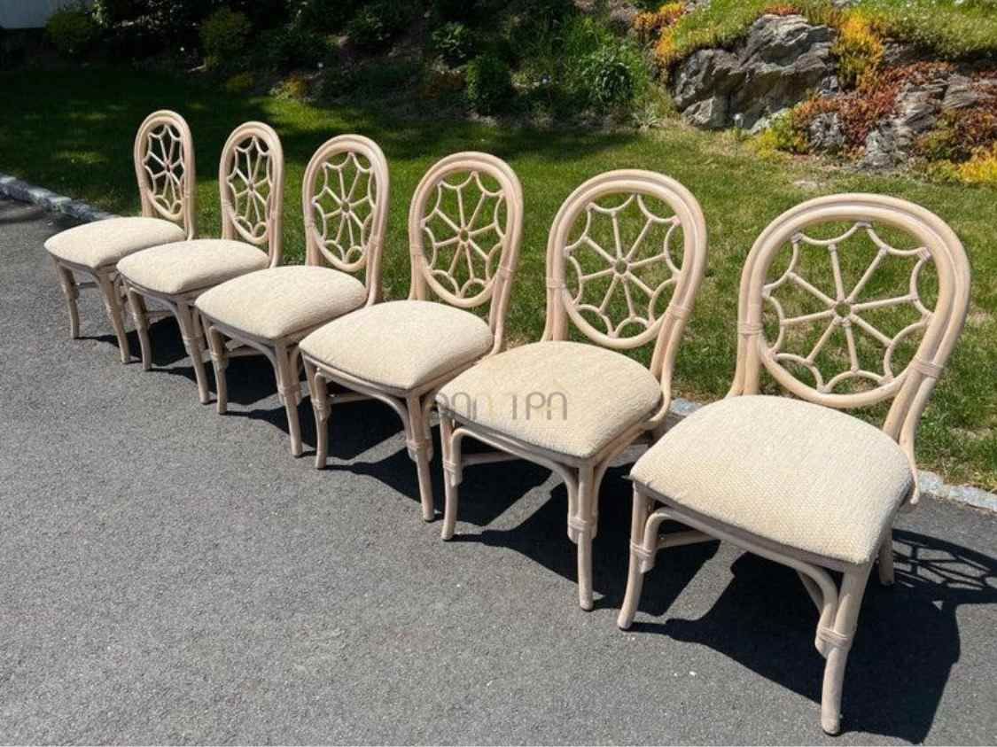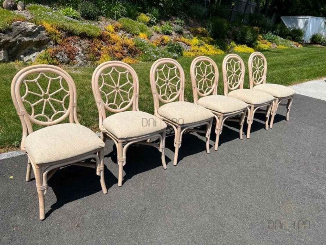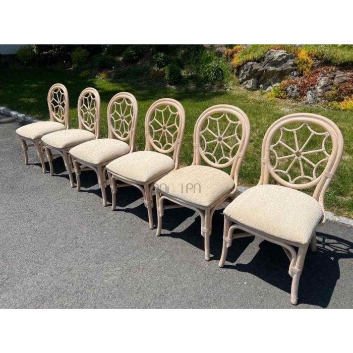 Bộ bàn ghế mây tre đan phòng ăn Spider có bàn oval trắng tinh tế và 6 ghế với họa tiết mạng nhện và bông hoa, mang đến vẻ đẹp sang trọng và độc đáo cho không gian ăn uống của bạn.