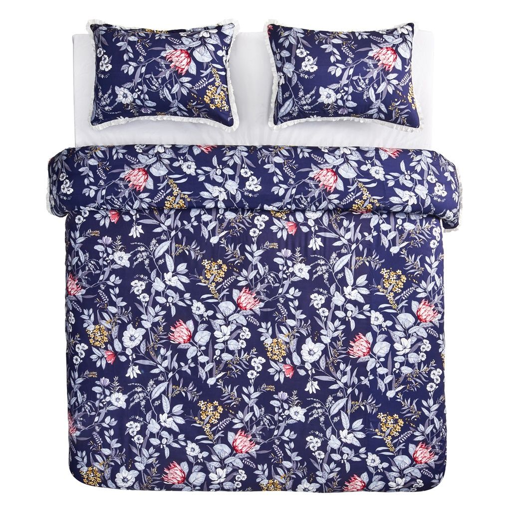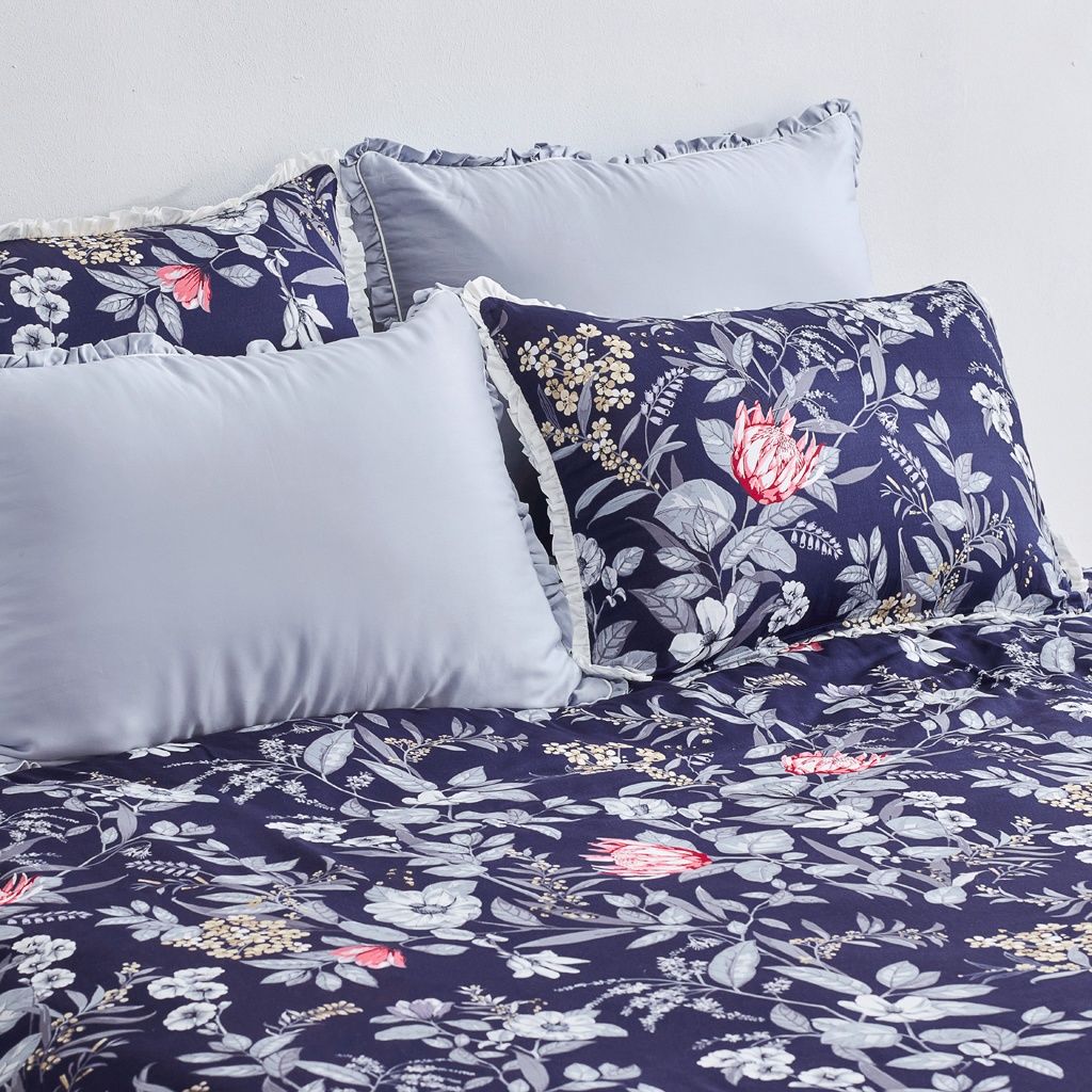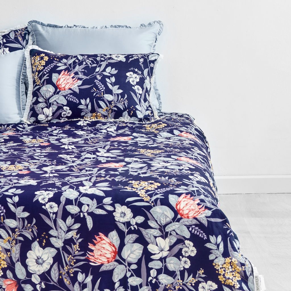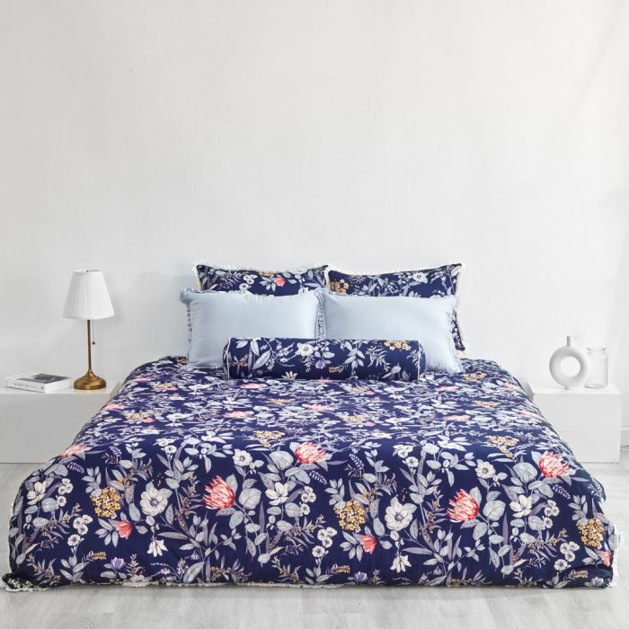 Bộ chăn ga EPM21071 chắc chắn sẽ mang đến cho bạn cảm giác đó. Điểm nhấn của bộ chăn ga là những bông hoa King Protea – quốc hoa của Nam Phi với màu hồng cam nổi bật, hòa quyện trong những chùm hoa nhỏ li ti. Hình ảnh hoa lá đua nhau khoe sắc trên nền vải xanh tím than tưởng như không hợp mà lại hòa quyện vô cùng.