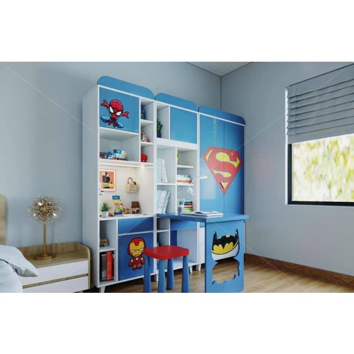 - Bộ góc học tập thông minh 3 in 1 cho bé trai – Batman đa công năng: Siêu phẩm tủ thông minh 3IN1 đúng như tên gọi, sẽ gồm có 3 module, tủ quần áo, bàn học gấp thông minh kèm kệ sách và kệ trưng bày đồ chơi, góc sáng tạo cho bé. Sản phẩm có thể tách rời giữa hệ tủ quần áo và tủ kèm bàn học hoặc tạo thành hệ tủ chữ L để phù hợp với căn phòng của các bé.