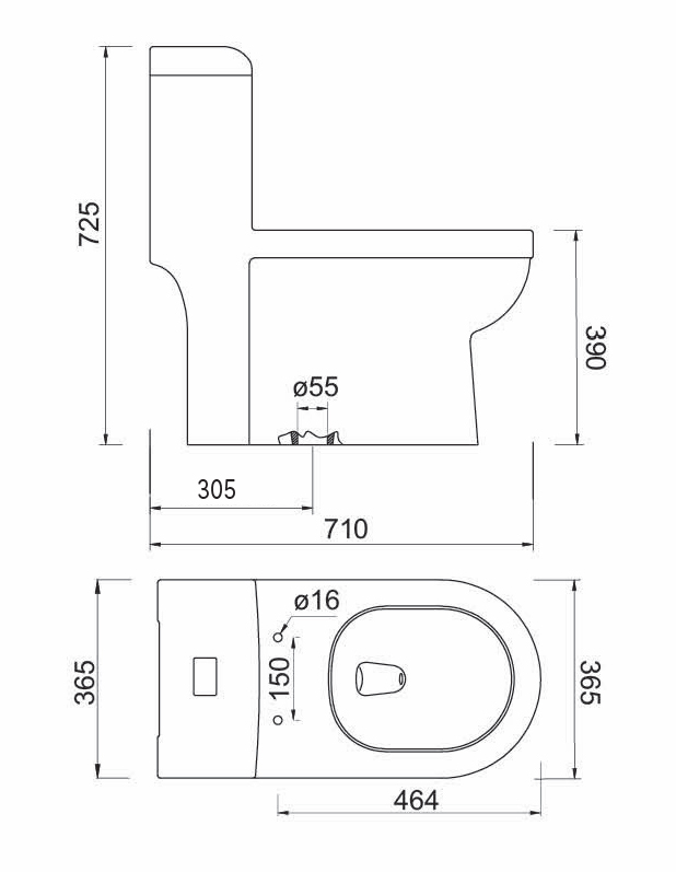 - Tâm xả: 305 ± 55 mm