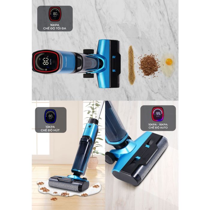 - Chế độ Tự động: Hệ thống cảm biến độ bẩn thông minh sẽ tự động điều chỉnh lượng nước đầu ra và lực hút theo nhu cầu sử dụng theo mức độ bẩn của các khu vực trên mặt sàn.