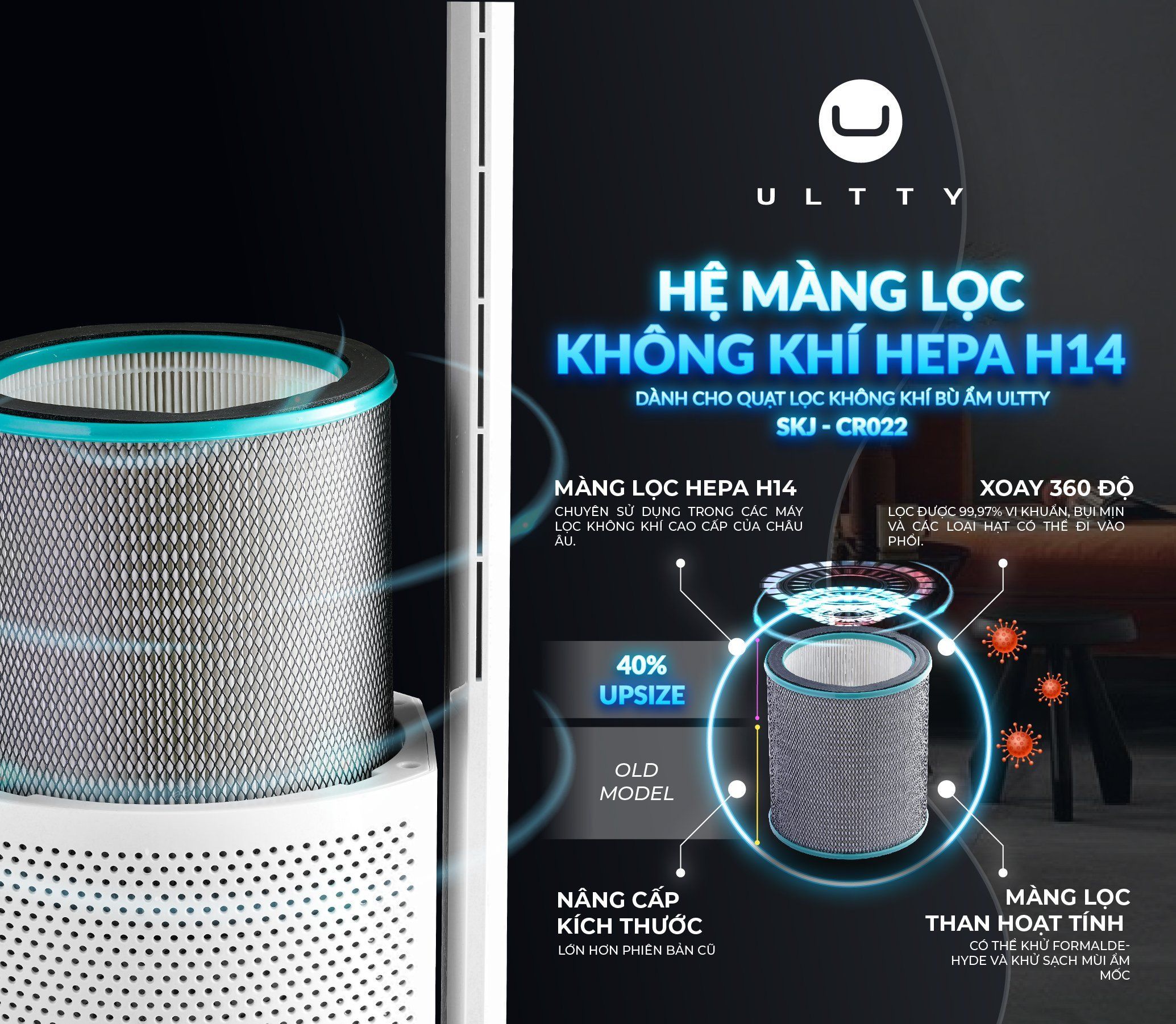 - Hệ màng lọc hình trụ 360 độ: Đa số màng lọc của các máy lọc không khí trên thị trường là hệ phẳng, chỉ lọc được một hướng duy nhất, còn hệ màng lọc của Ultty SKJ-CR022 có cấu tạo hình trụ, giúp khả năng lọc 360 độ, lưu trữ bụi hiệu quả vượt trội.