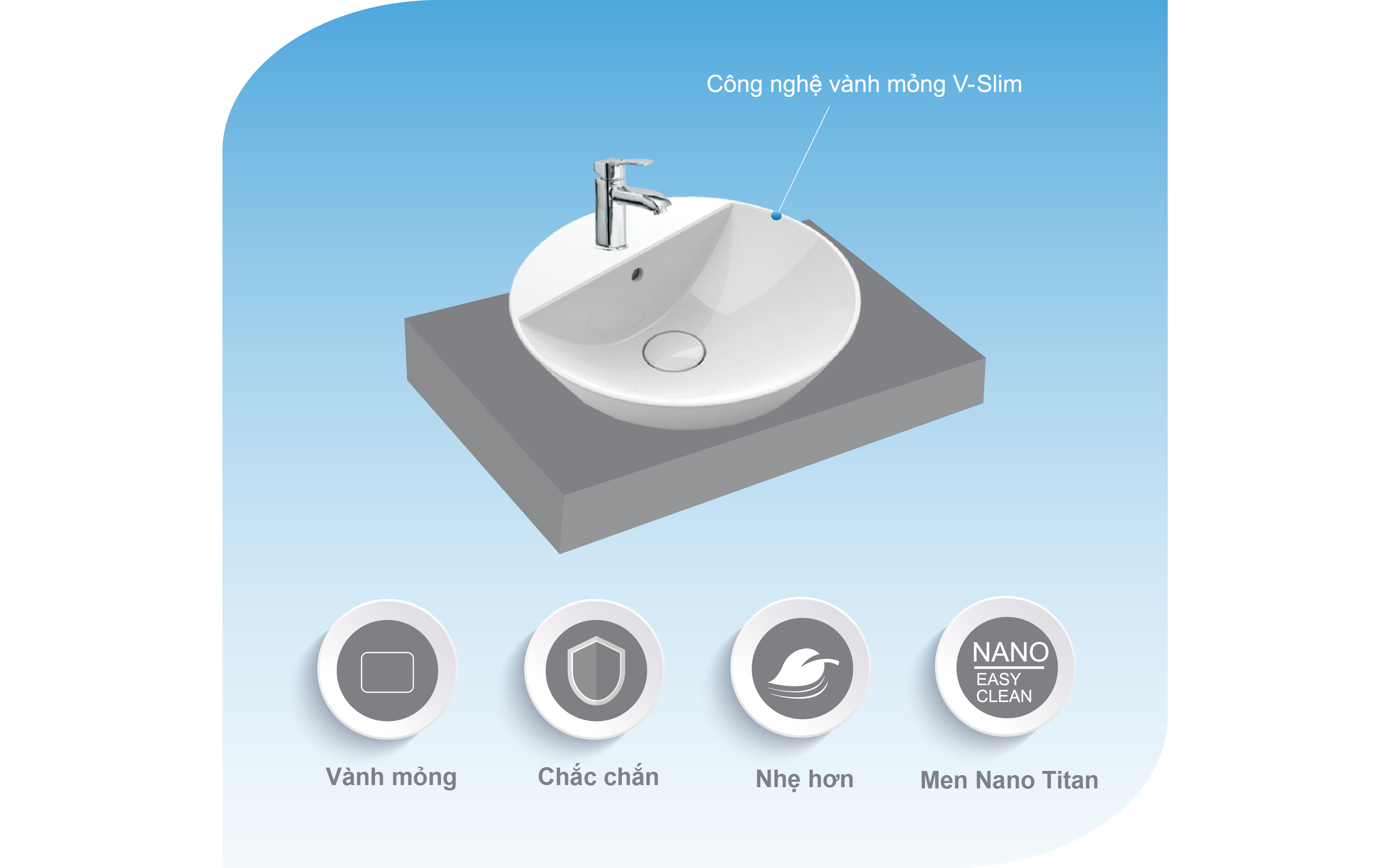Bề mặt chậu vành mỏng V26 được bao phủ bởi lớp men Nano Titan, giúp duy trì vẻ trắng bóng cùng khả năng tự làm sạch, ngăn ngừa vi khuẩn lên đến 89%. Công nghệ men độc quyền của Viglacera cũng được ứng dụng trên nút xả sứ đi kèm chậu, vừa tăng tính thẩm mỹ đồng bộ, vừa hạn chế hoen gỉ và mảng bám trên bề mặt sản phẩm.