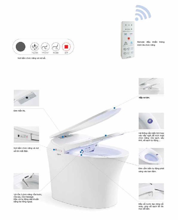 - Hệ thống cảm biến tích hợp vào nắp ngồi giúp nhận biết khi có người sử dụng để kích hoạt chức năng xả tự động, sấy khô