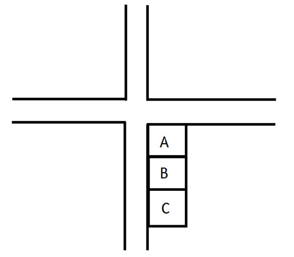 Ví dụ: Có 3 ngôi nhà được xây ở các vị trí A, B, C như hình. Nhà A, nhà B, nhà C đều sở hữu mặt tiền và nằm ở vị trí thuận lợi. Tuy nhiên, theo các chuyên gia bất động sản thì nhà A và nhà C sẽ được định giá cao hơn so với nhà B (cùng diện tích) vì nhà B đã bị đâm hông bởi nhà khác.