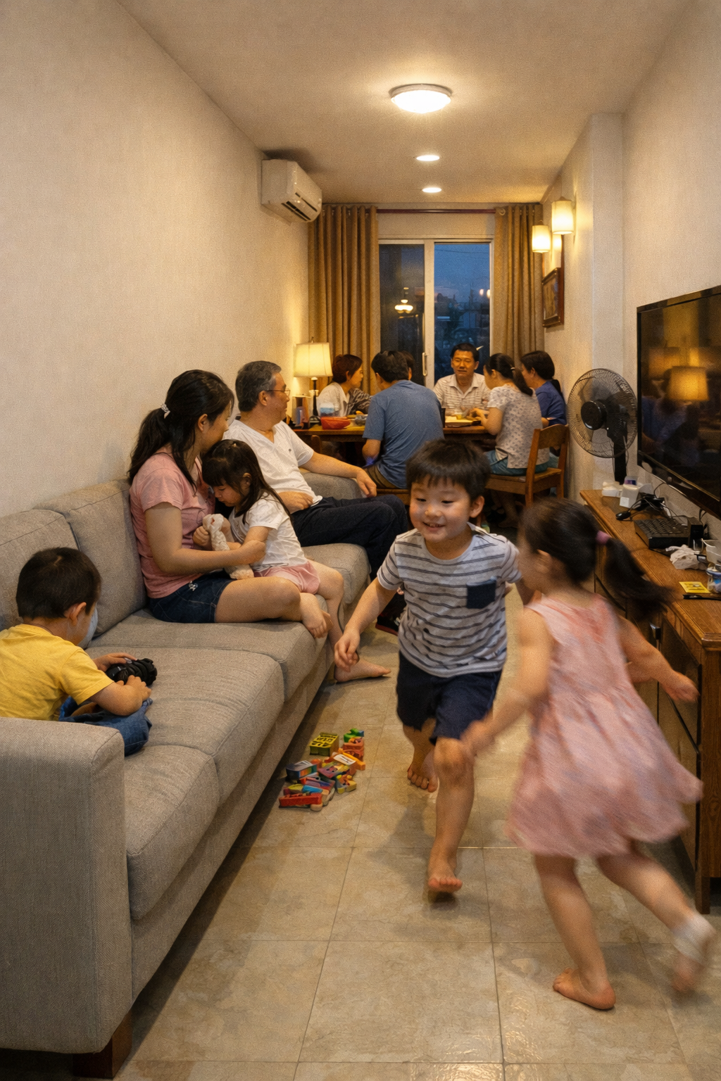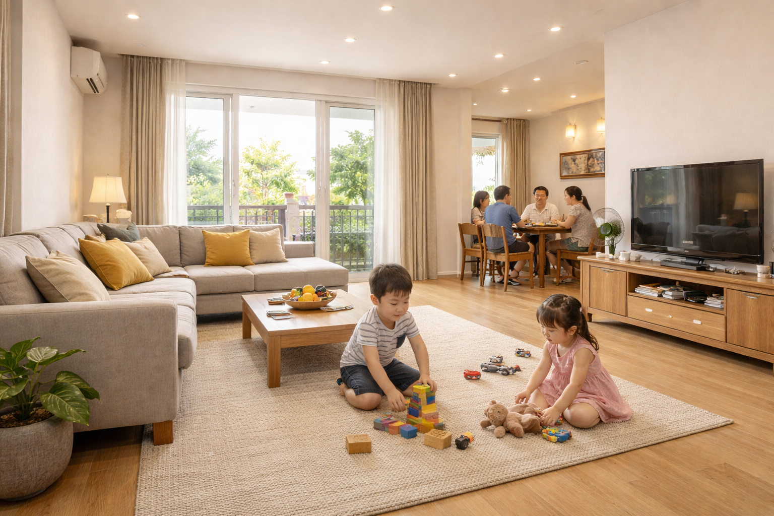 Với gia đình có trẻ nhỏ, phòng khách dọc càng bộc lộ nhược điểm. Diện tích hẹp khiến trẻ chạy nhảy dễ va chạm, sinh hoạt chung thiếu sự thoải mái. Ở mức chấp nhận được, nhưng không tạo cảm giác muốn gắn bó lâu dài.