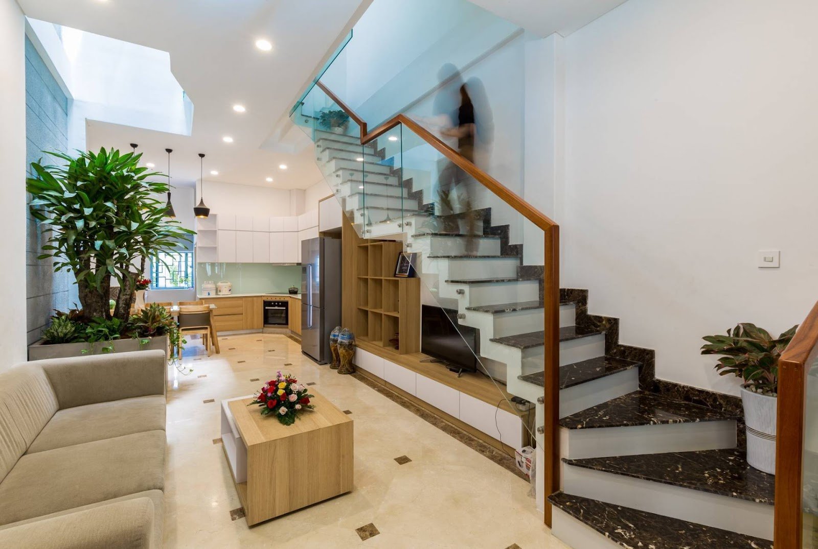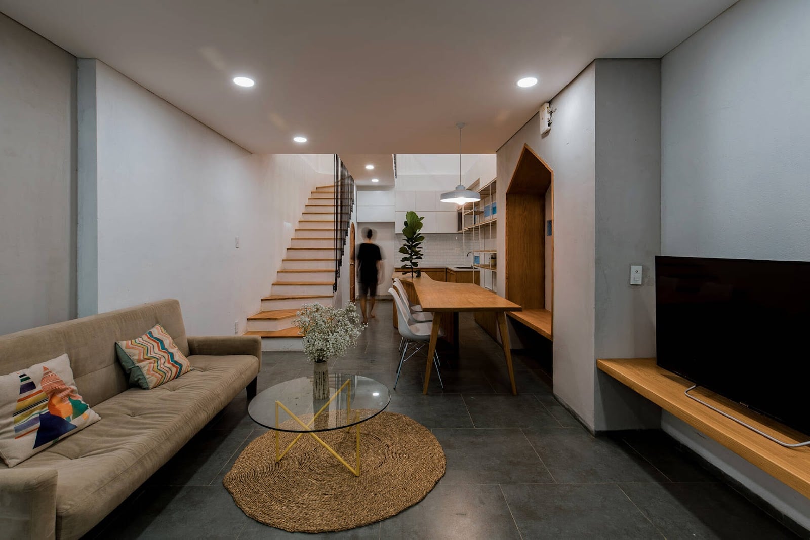 Điều này giúp phòng khách không chỉ “đẹp” mà còn “thực dụng” – rất phù hợp với nhà ống hiện đại.