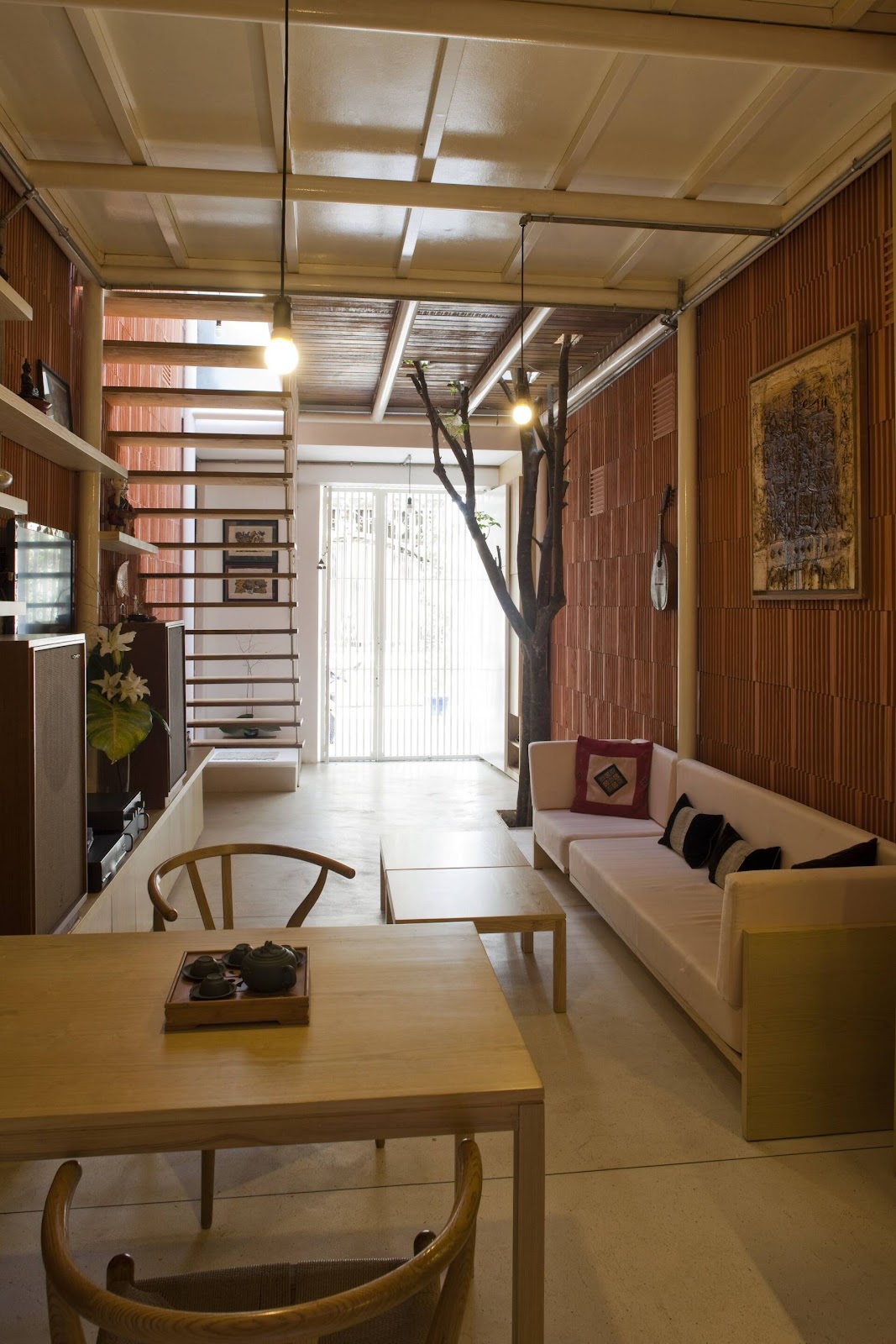 Mẫu thiết kế phòng khách nhà ống đẹp 4m trong ngôi nhà gạch mộc (Ảnh: HL House)