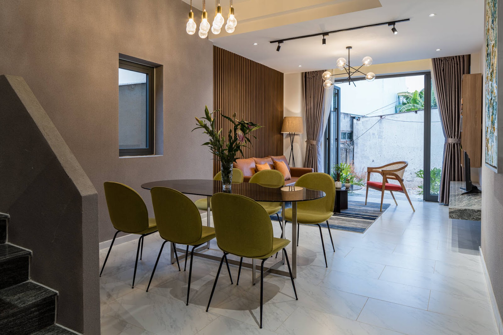 Mẫu thiết kế phòng khách nhà ống đẹp 4m kết hợp phòng ăn trong nhà tại 4x17 tại Sài Gòn (Ảnh: Nhà Hai Mái Tôn)