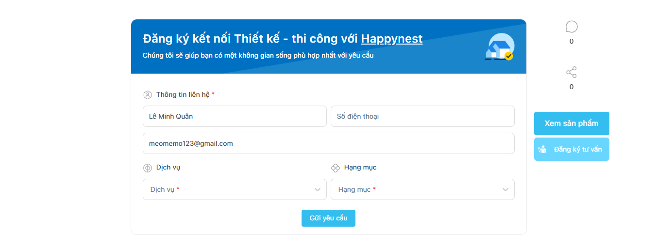 Điền đầy đủ thông tin vào form đăng ký và đội ngũ tư vấn của Happynest sẽ giúp bạn kết nối nhanh chóng với đơn vị thiết kế nội ngoại thất uy tín tại Hà Nội phù hợp nhất