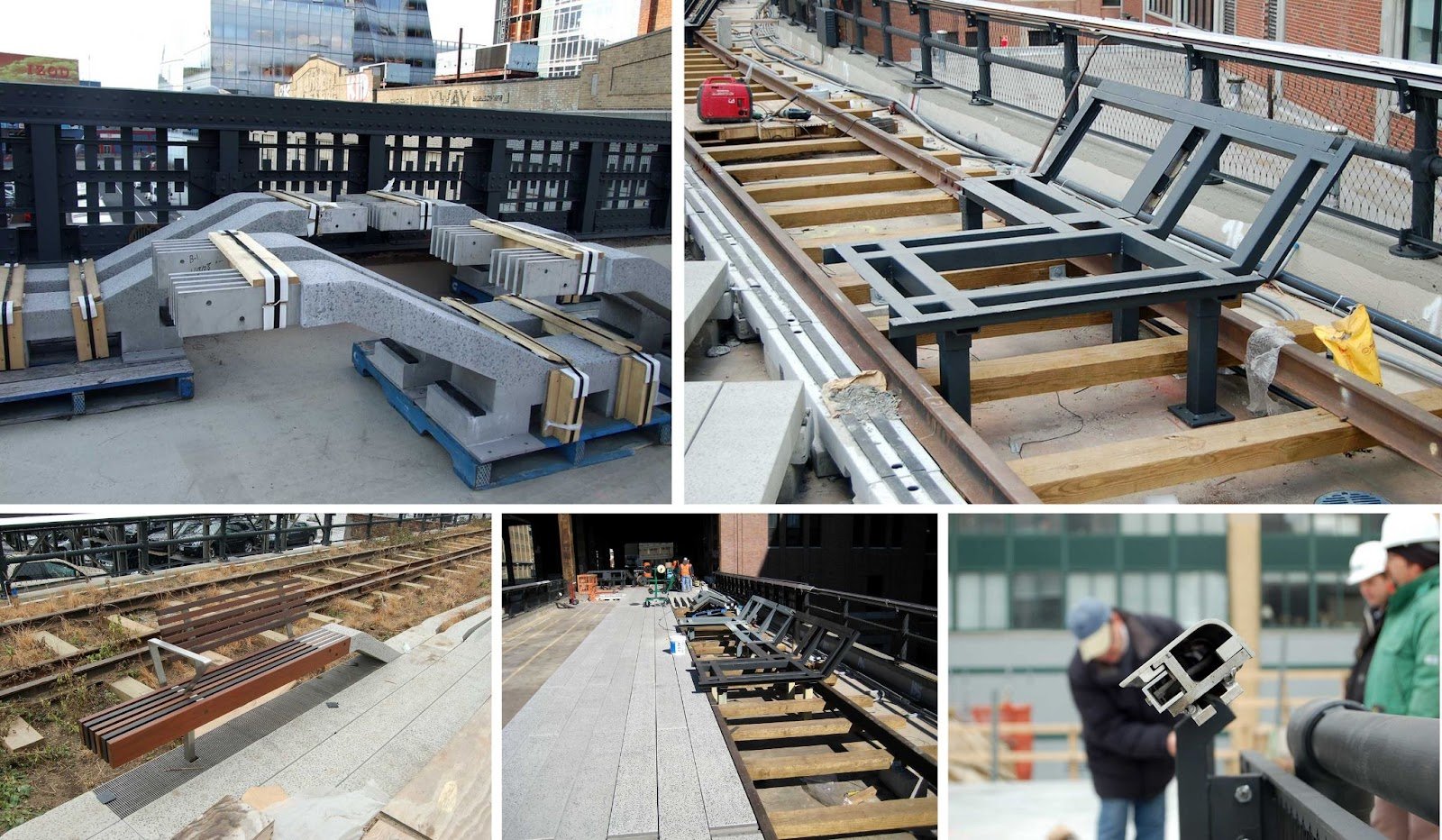 Ở High Line, cấu trúc thép của tuyến đường sắt cũ được giữ nguyên gần như toàn bộ, chỉ gia cường kết cấu chịu lực và thay thế những chi tiết xuống cấp. Các bậc đi bộ, dải cây, ghế nghỉ, đèn chiếu sáng lồng ghép tinh tế vào khung thép sẵn có. Sự can thiệp tiết chế giúp dự án vừa mang dáng dấp công nghiệp, vừa mang hơi thở của thiên nhiên và con người.