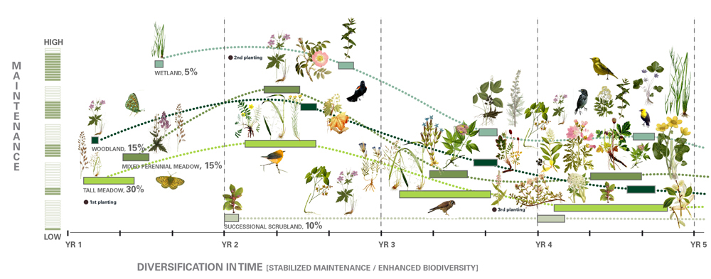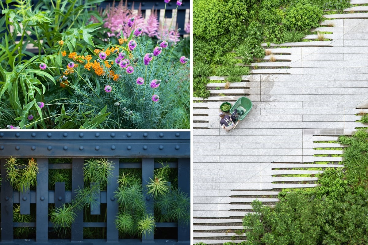 Cấu trúc này thể hiện rõ qua từng chi tiết, các tấm bê tông lát xếp thành dải hẹp, xen kẽ các khe hở cho cỏ dại mọc xuyên qua. Những mảng cây trồng tổ chức theo đặc tính ánh sáng, độ ẩm và hướng gió, tạo nên chuỗi vi khí hậu (micro-climates) đa dạng dọc tuyến. Có đoạn tràn ngập nắng, có đoạn rợp bóng cây, có nơi mở ra tầm nhìn toàn cảnh khu Hudson, nơi khác lại gợi cảm giác lặng yên giữa những tòa nhà gạch đỏ.