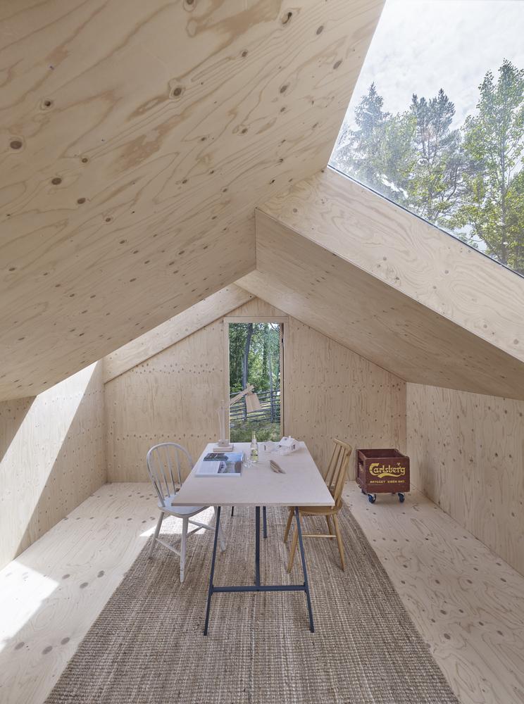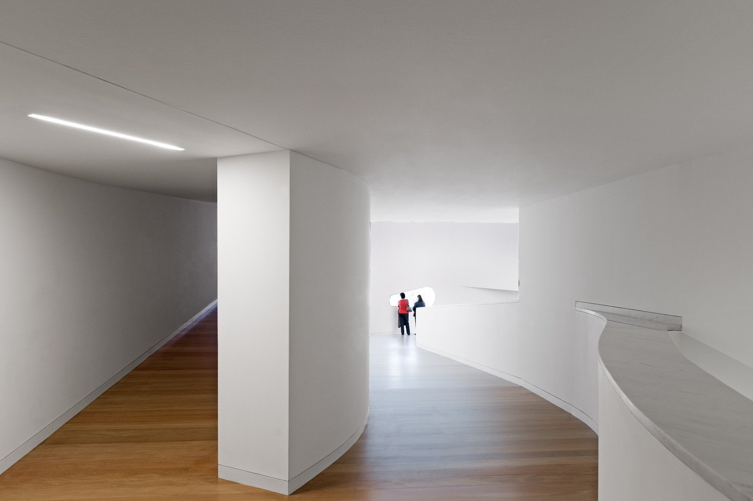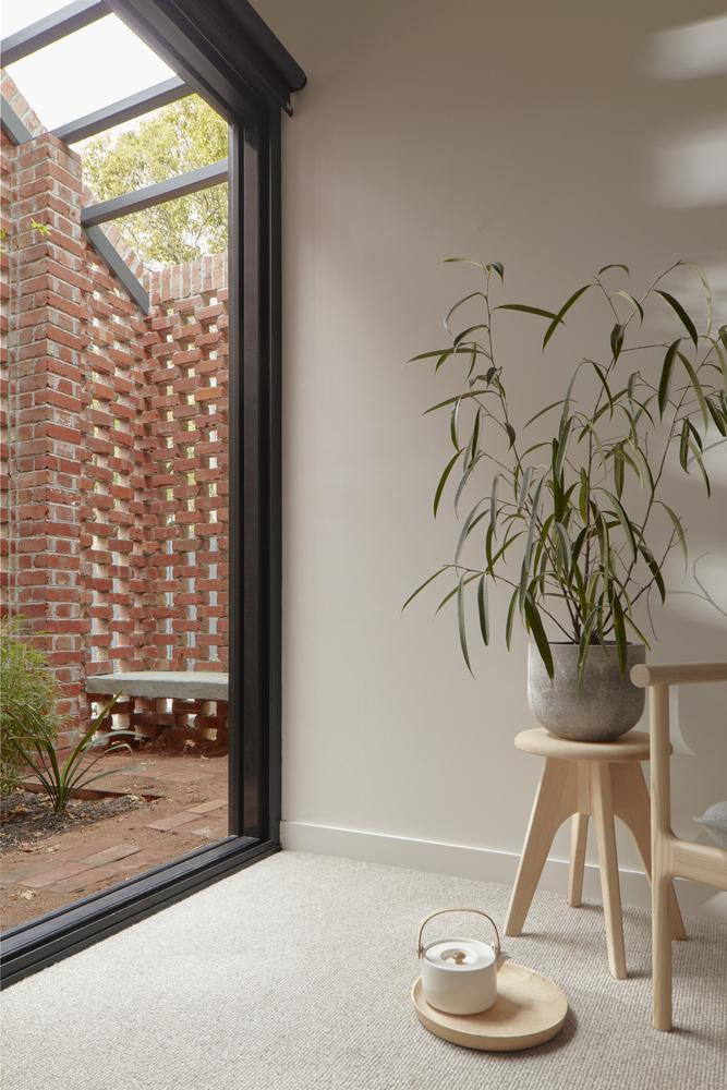 Chân tường âm nổi tạo khe giúp tường như “lơ lửng” trên sàn, tạo hiệu ứng hiện đại tinh tế nhờ khe hở nhỏ bằng nhôm sơn đồng màu hoặc đen làm điểm nhấn. (Ảnh: Joana França)
