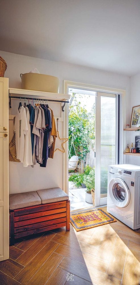 Không gian giặt – phơi kết hợp lưu trữ quần áo, tận dụng ánh sáng tự nhiên và lối ra sân sau để phơi đồ thuận tiện. Tủ, móc treo và băng ghế giúp khu vực này vừa tiện dụng vừa dễ giữ gọn.