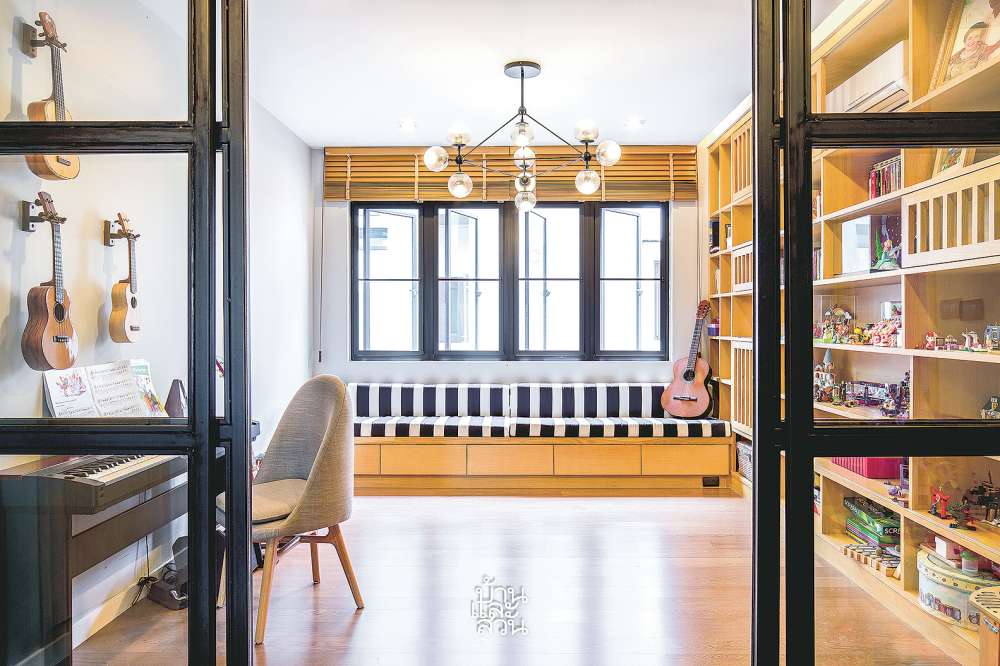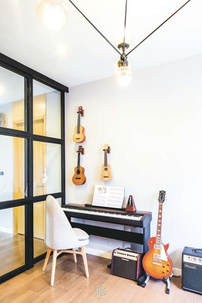 Phòng âm nhạc nhỏ được cải tạo từ phòng sau nhà, bố trí gọn gàng để tập nhạc cá nhân mà không gây ảnh hưởng đến không gian xung quanh. Diện tích vừa đủ giúp kiểm soát âm thanh tốt hơn.