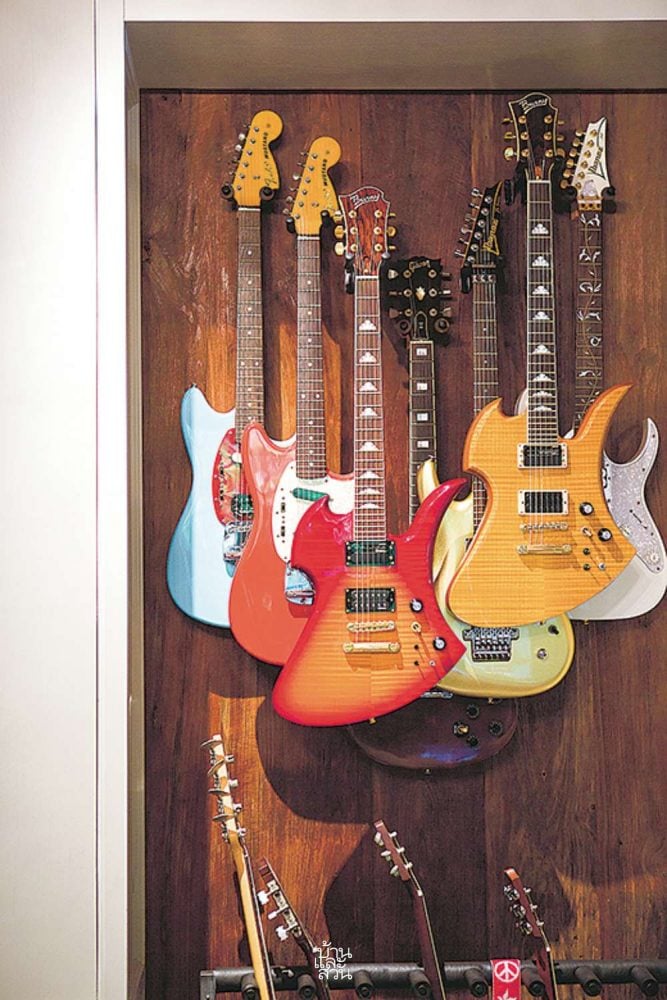 Bên trong nên bố trí tủ cao để đựng sách nhạc, ampli, phụ kiện. Đàn guitar thường dùng có thể đặt trên giá đứng, còn đàn ít dùng thì treo tường hoặc cất trong hộp để bảo quản tốt hơn.