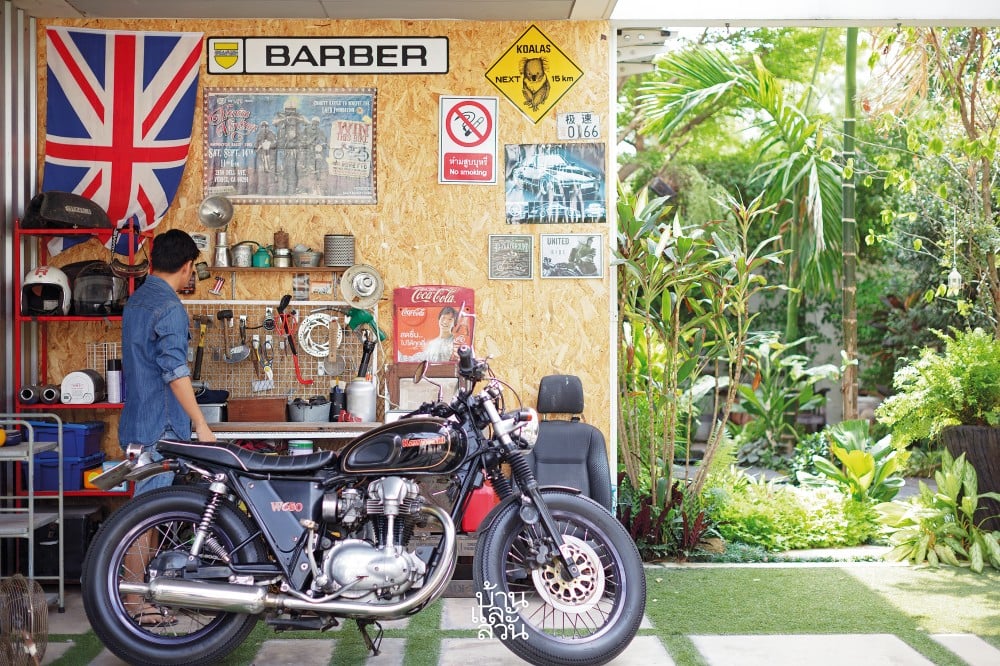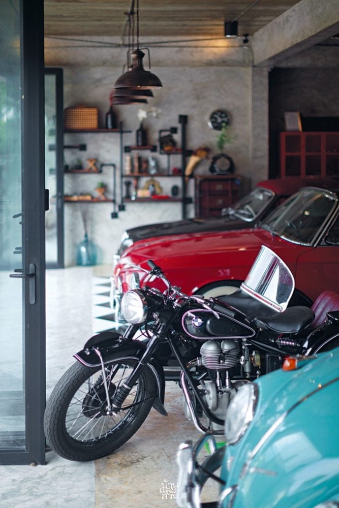 Gara được tận dụng làm không gian sửa chữa và lưu trữ dụng cụ với hệ kệ treo tường và bảng treo đồ nghề, giúp các vật dụng luôn gọn gàng và dễ lấy khi cần. Cách sắp xếp này phù hợp với những gia đình thường xuyên tự bảo dưỡng xe hoặc đồ dùng.