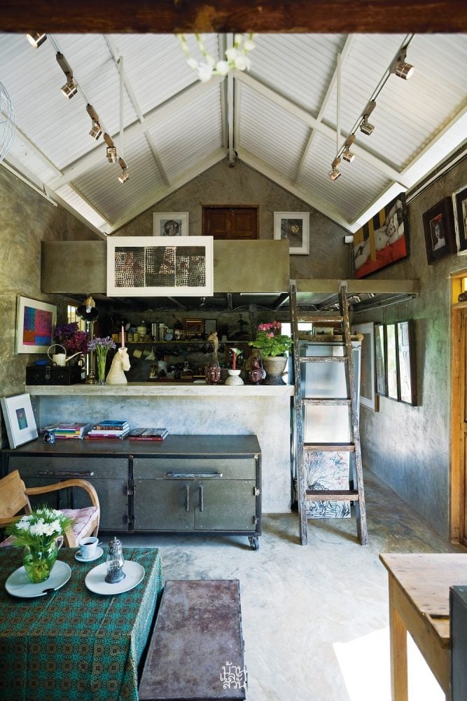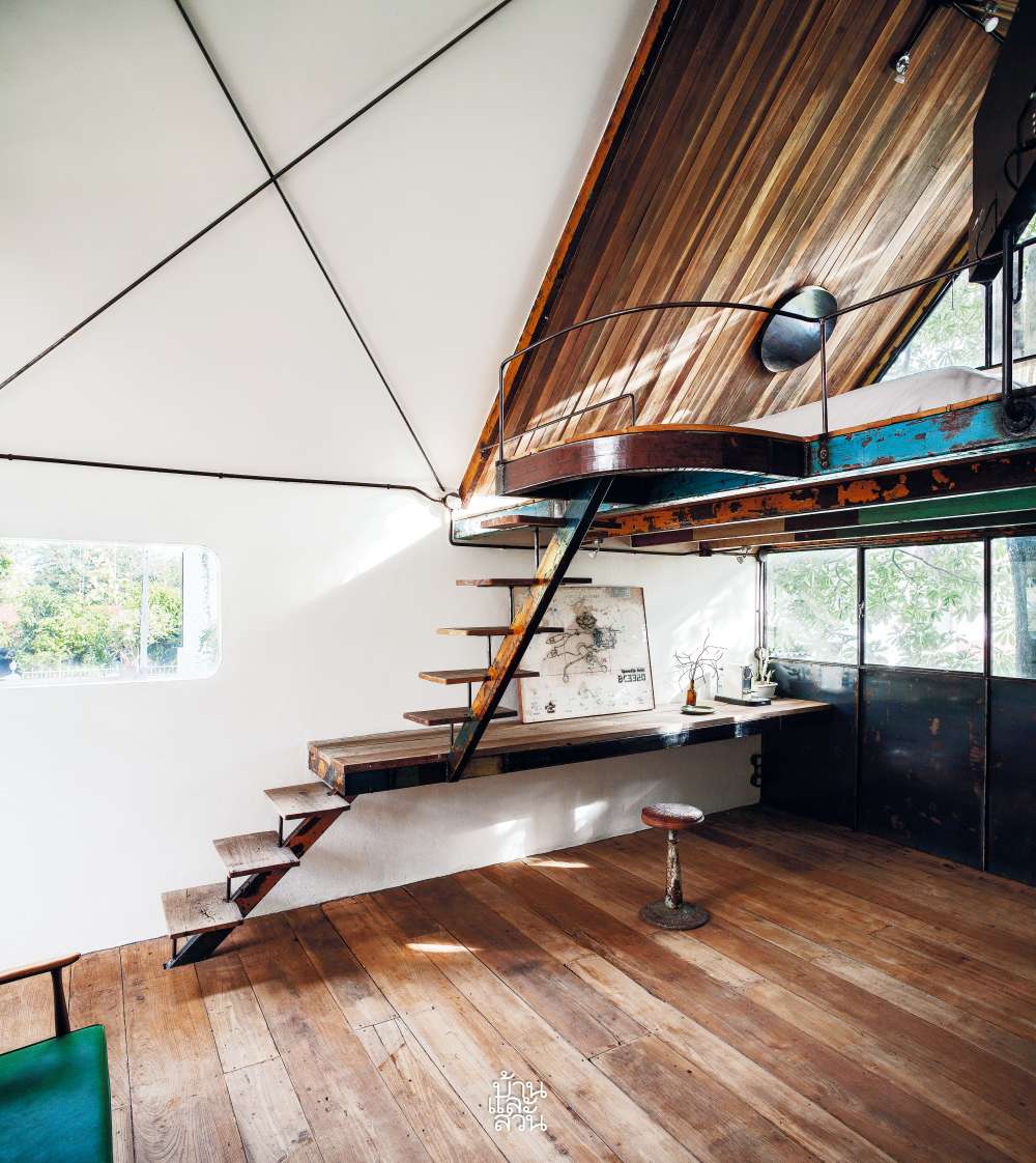 Không gian gác lửng kết hợp khu làm việc bên dưới, tận dụng chiều cao mái để mở rộng công năng sử dụng. Cầu thang gọn nhẹ giúp tiếp cận gác mái mà không chiếm nhiều diện tích sàn.