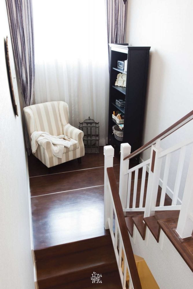 Chiếu nghỉ cầu thang được sắp xếp thành góc ngồi đọc sách nhỏ, tận dụng ánh sáng tự nhiên từ cửa sổ bên cạnh. Cách bố trí này giúp không gian chuyển tiếp trở nên hữu ích và dễ chịu hơn.