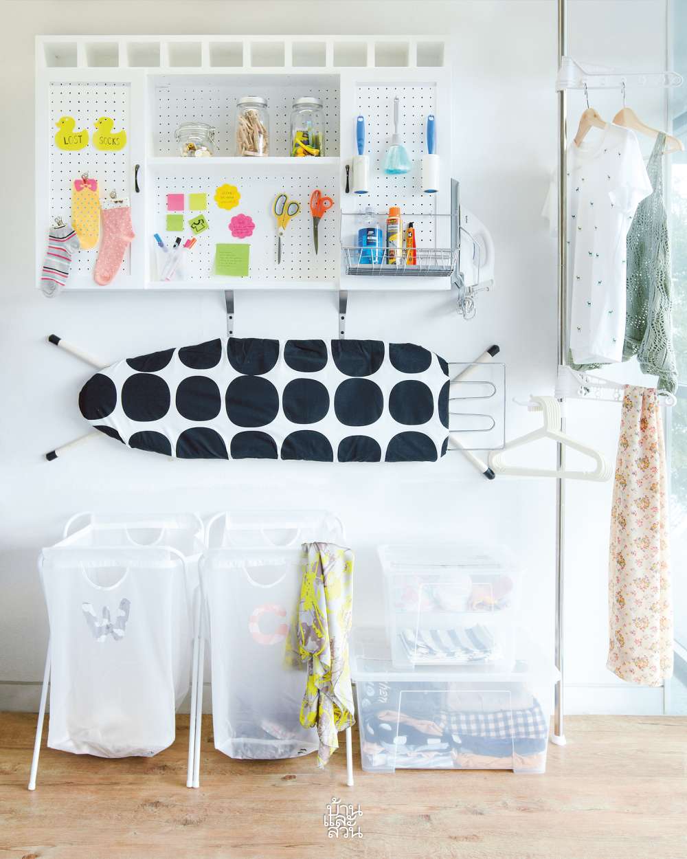Gắn thanh treo quần áo lên tường để phơi tạm hoặc sắp xếp đồ đã là. Bàn là có thể thiết kế dạng gập gắn tường để tiết kiệm không gian. Một chiếc tủ lớn để chứa chất tẩy rửa, dụng cụ vệ sinh cũng rất cần thiết. Thậm chí khu giặt phía sau còn có thể chừa một góc làm bể cát cho trẻ chơi.