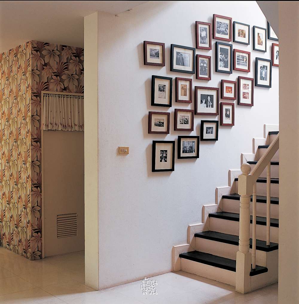 Chiếu nghỉ cầu thang được tận dụng làm gallery treo ảnh gia đình, tạo điểm nhấn ấm áp cho lối đi trong nhà. Cách sắp xếp khung ảnh gọn gàng giúp không gian không bị rối mắt.