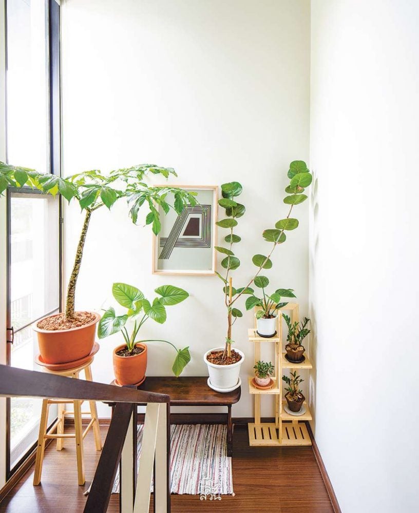 Chiếu nghỉ cầu thang trở thành góc đặt cây xanh và tranh trang trí, mang lại cảm giác thư giãn khi di chuyển giữa các tầng. Không gian nhỏ nhưng vẫn đủ sinh động và có cá tính.