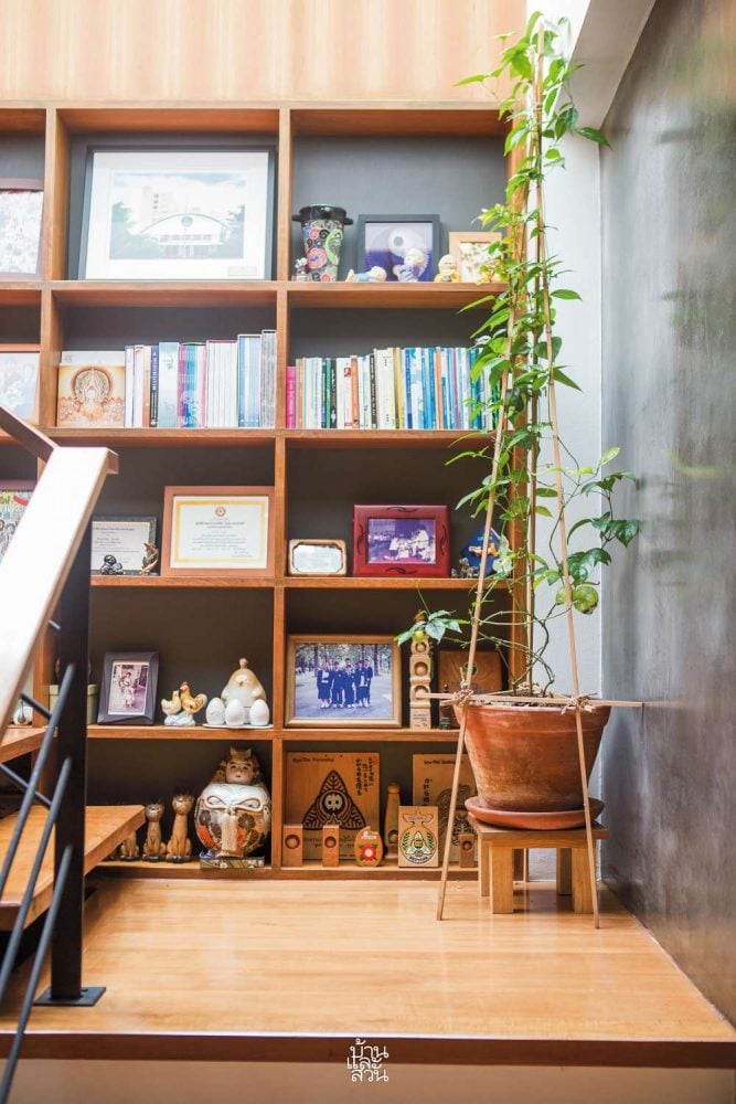 Khu vực chiếu nghỉ được bố trí kệ sách và đồ lưu niệm, biến lối cầu thang thành góc trưng bày mang dấu ấn riêng của gia chủ. Giải pháp này giúp tận dụng tốt khoảng không thường bị bỏ trống.