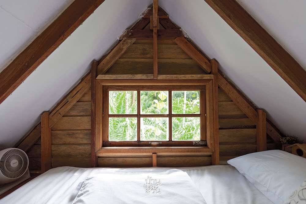 Gác mái nhỏ được cải tạo thành khu nghỉ ngơi yên tĩnh, sử dụng vật liệu gỗ tạo cảm giác ấm cúng và riêng tư. Cửa sổ nhỏ giúp lấy sáng tự nhiên và thông gió, phù hợp với không gian trên cao.