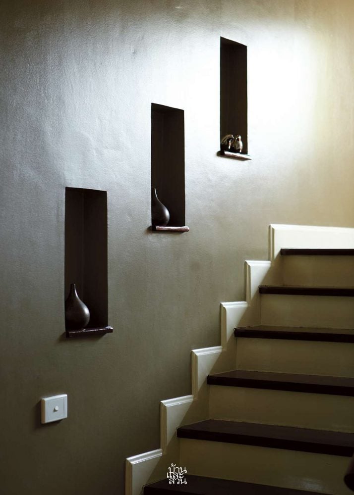 Tường chiếu nghỉ cầu thang được thiết kế hốc âm để trưng bày đồ trang trí nhỏ, vừa tiết kiệm diện tích vừa tăng chiều sâu thị giác. Ánh sáng hắt nhẹ giúp khu vực này thêm nổi bật.