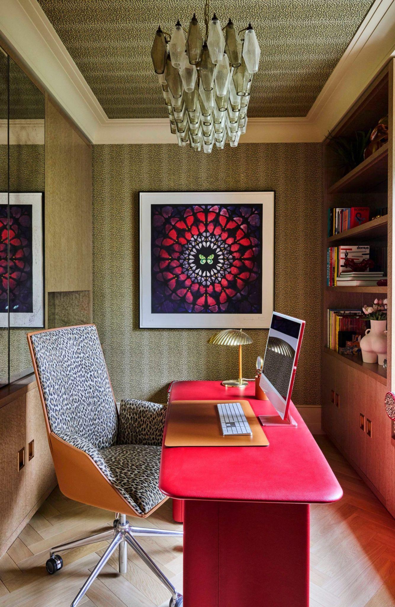 Nếu bạn yêu thích sự phá cách và táo bạo, hãy thử nghiệm các mẫu giấy dán tường họa tiết mạnh. Nhà thiết kế Trilbey Gordon đã phủ áo mới cho phòng làm việc tại London bằng giấy dán họa tiết da báo trải dài từ tường lên trần. Lấy cảm hứng từ phong cách của Carlo Mollino, thiết kế này tạo nên sự đồng điệu thú vị với các tác phẩm nghệ thuật treo tường và ghế bọc cùng họa tiết, biến căn phòng thành một tuyên ngôn cá tính.