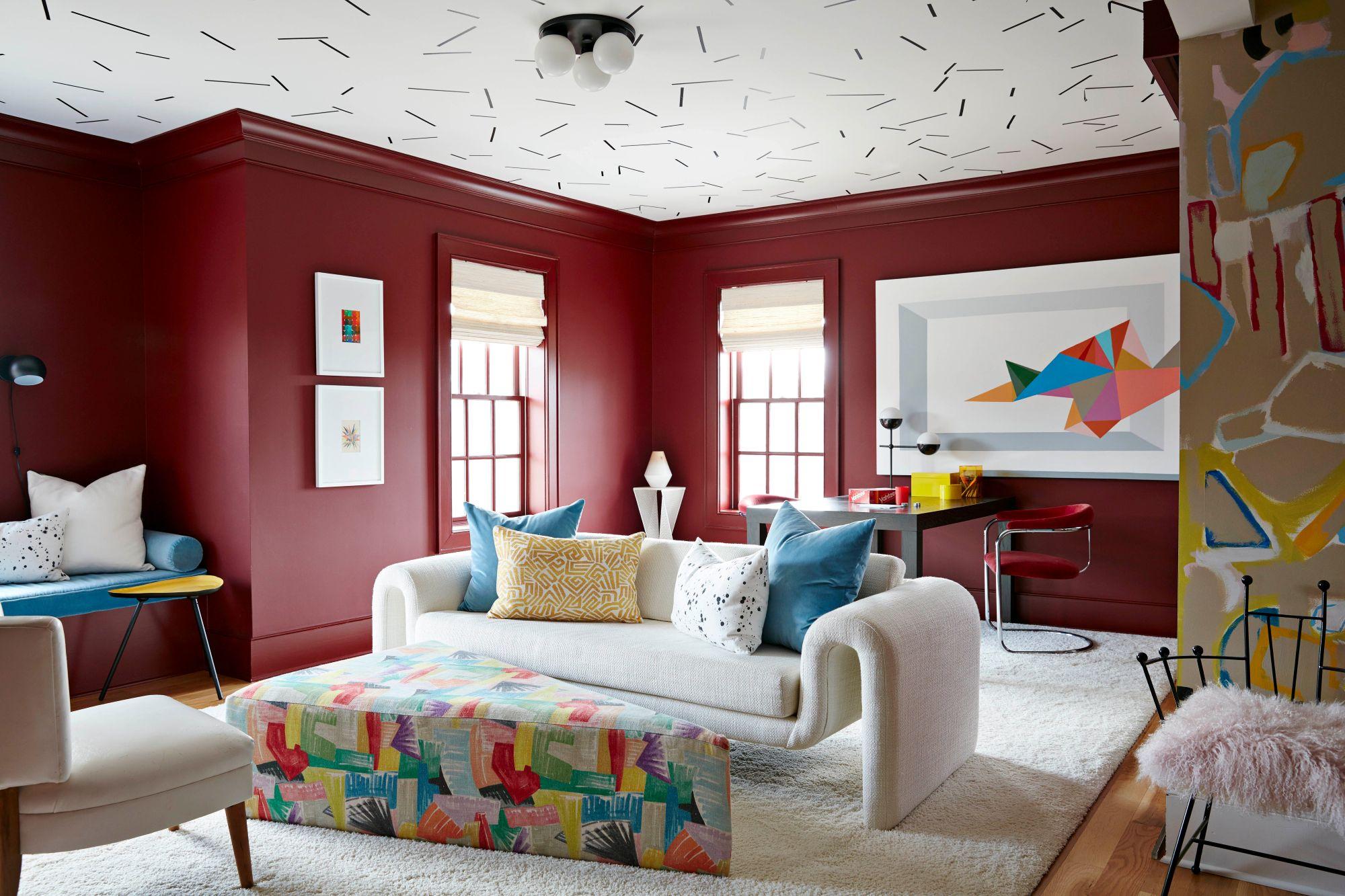 Không gian sống sẽ trở nên vui tươi hơn bao giờ hết nhờ những nét vẽ ngẫu hứng. Nghệ sĩ Angela Chrusciaki Blehm đã tự tay vẽ những họa tiết confetti rực rỡ lên nền trần trắng tại ngôi nhà ở Atlanta. Sự xuất hiện của những mảnh màu nhảy múa trên trần tương phản mạnh mẽ với bức tường đỏ thẫm xung quanh, đồng thời kết nối nhịp nhàng với các món đồ nội thất hình học bên dưới.