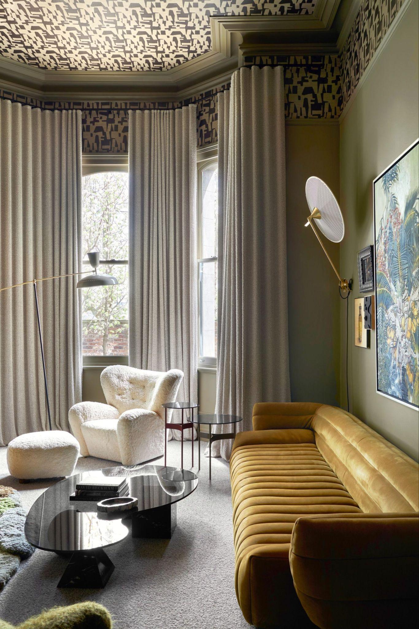Thay vì sơn hay ốp gỗ, việc sử dụng vải để bọc trần mang lại cảm giác êm ái và sang trọng khó tả. Tại một công trình ở Melbourne, nhà thiết kế Simone Hagg đã khéo léo phủ lên trần nhà và phần viền tường lớp vải tông màu khói nhẹ nhàng. Những họa tiết hình học in nổi trên bề mặt vải vừa đóng vai trò trang trí, vừa tạo chiều sâu thị giác, giúp căn phòng đạt được sự cân bằng hoàn hảo về thẩm mỹ.