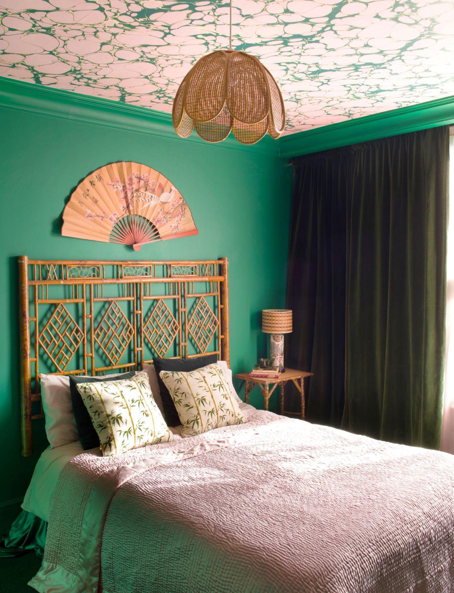 Sự kết hợp giữa các yếu tố cổ điển luôn mang lại sức hút đặc biệt. Whinnie Williams đã tái hiện tinh thần thập niên 1970 trong phòng ngủ của mình bằng cách phối trần nhà họa tiết vân đá với tường xanh lục tươi sáng. Để hoàn thiện vẻ đẹp hoài cổ này, nội thất mây tre đan được đưa vào không gian, tạo nên tổng thể vừa mang hơi thở Á Đông, vừa gần gũi với thiên nhiên.
