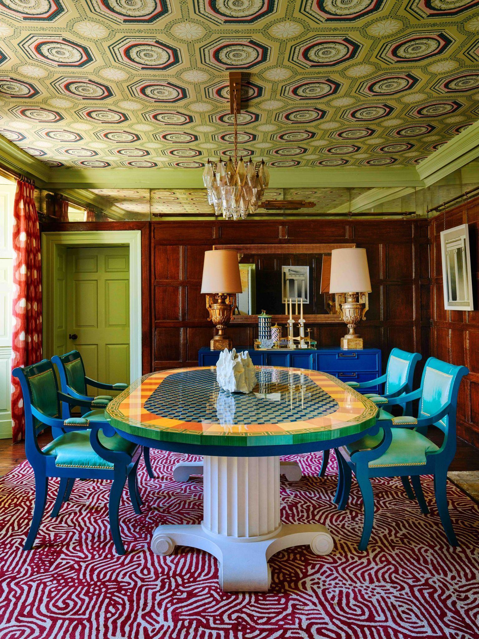Đôi khi, sự đối lập lại tạo nên sự hài hòa không ngờ. Tại ngôi nhà vùng Cotswolds, nhà thiết kế Henri Fitzwilliam-Lay đã biến trần phòng ăn thành tâm điểm với giấy dán màu xanh lá cây bắt mắt. Chính sự tương phản gay gắt giữa trần nhà xanh và các chi tiết nội thất tông đỏ rực rỡ bên dưới như rèm cửa, thảm trải sàn đã thổi bùng sức sống mãnh liệt cho không gian sum họp này.