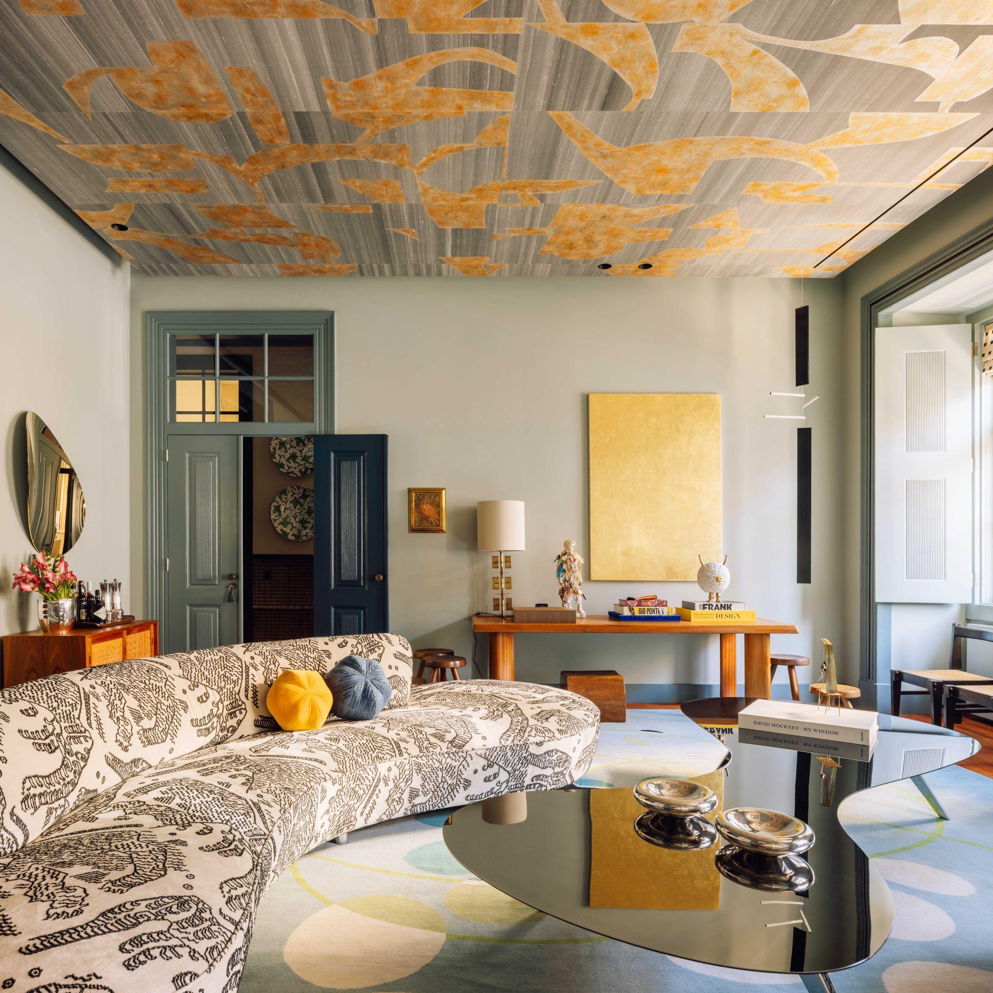Lụa luôn là biểu tượng của sự sang trọng và quý phái. Trong một dự án tại Lisbon, nhà thiết kế Gracinha Viterbo đã nâng tầm thẩm mỹ cho phòng khách bằng cách phủ kín trần nhà với giấy dán lụa cao cấp từ de Gournay. Chất liệu óng ả cùng họa tiết tinh xảo biến trần nhà thành một bức tranh nghệ thuật khổng lồ, mang lại vẻ đẹp lộng lẫy và tràn đầy năng lượng.
