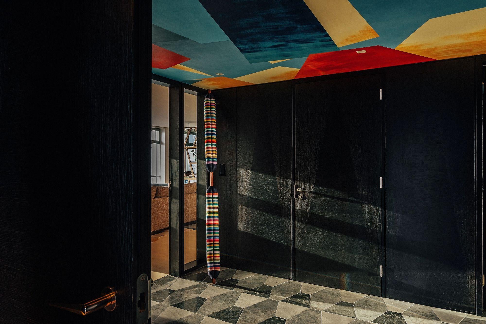 Lối vào nhà là nơi tạo ấn tượng đầu tiên, vì thế đừng để chúng nhạt nhòa. Tại căn hộ Centre Point, khu vực tiền sảnh trở nên sống động nhờ trần nhà được vẽ tay với tổ hợp màu xanh, đỏ và vàng lấy cảm hứng từ ánh hoàng hôn. Những hình khối trừu tượng trên cao đối thoại tinh tế với sàn đá vôi đa sắc bên dưới, tạo nên tổng thể hài hòa về màu sắc ngay từ bước chân đầu tiên.